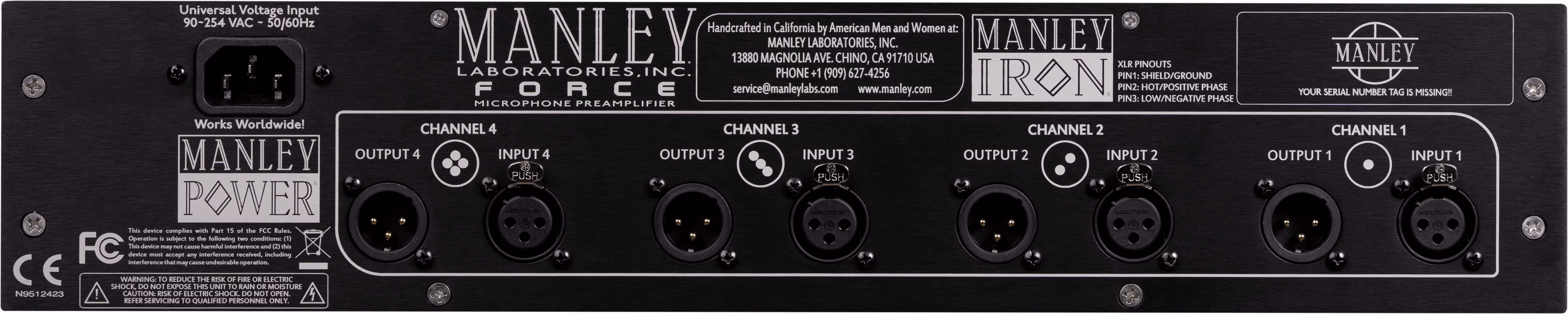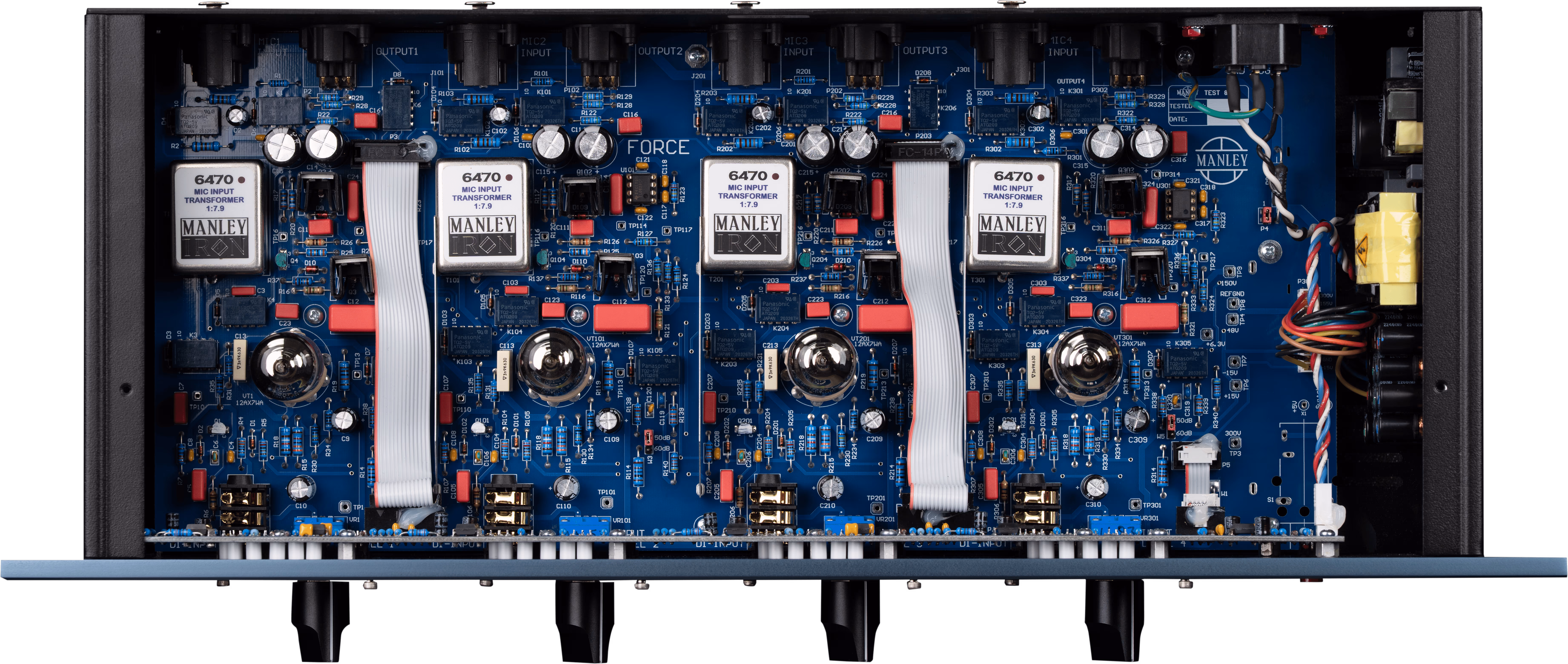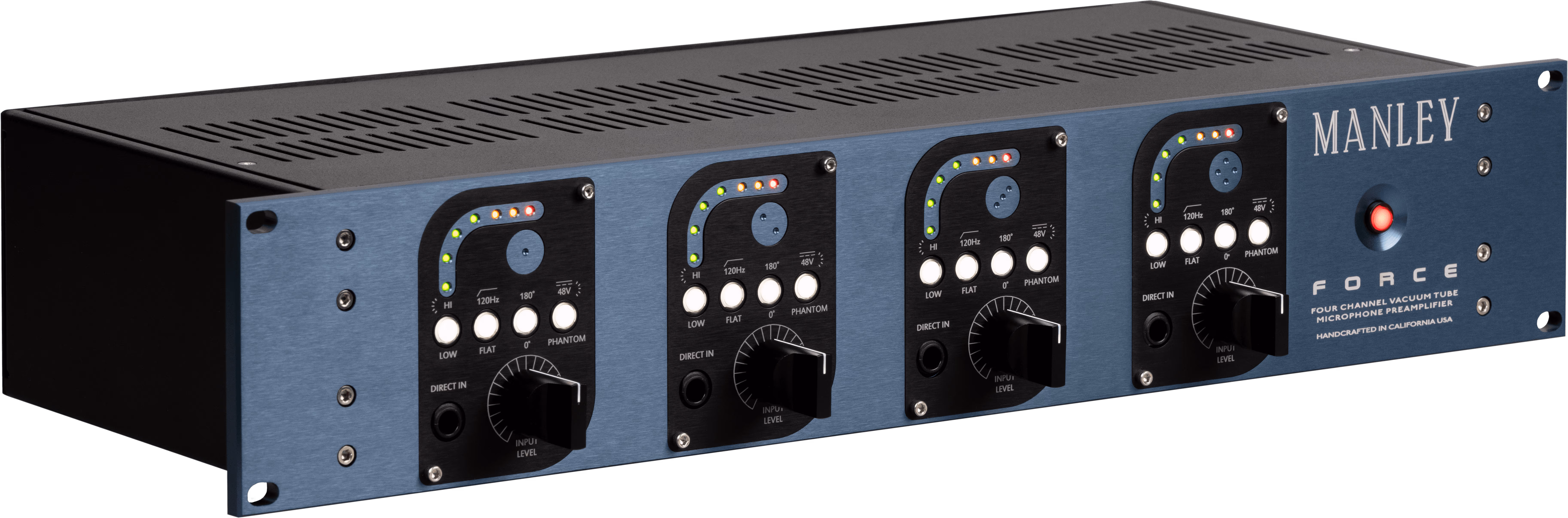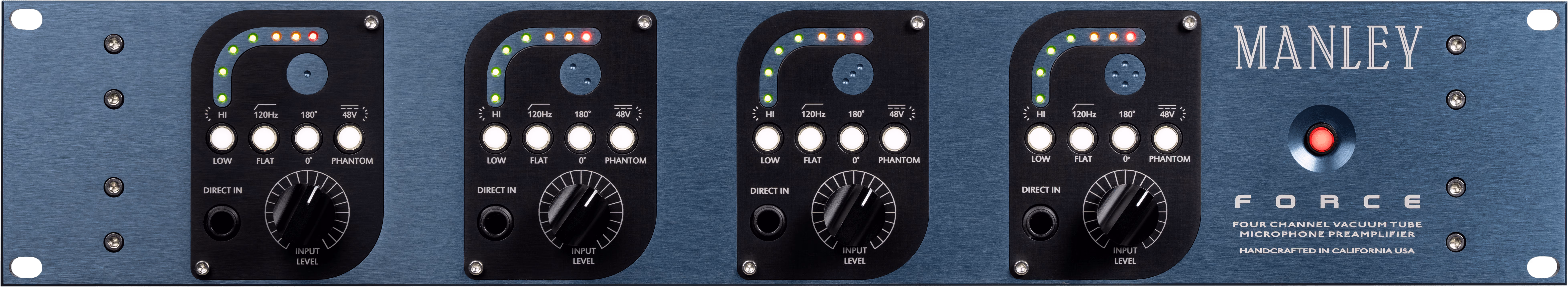 At the core of the Force is its all-tube, Class-A topology. Each channel combines a custom-wound Manley IRON® input transformer with a 12AX7 dual triode vacuum tube, delivering wide dynamic range and rich harmonic detail. The dedicated front-panel Hi-Z input accepts line-level or instrument signals, routing them directly into the tube gain stage for tone shaping electric guitars, basses, and keyboards. If you use plugin amps in your DAW you can FEEL the difference when playing through a tube DI.
